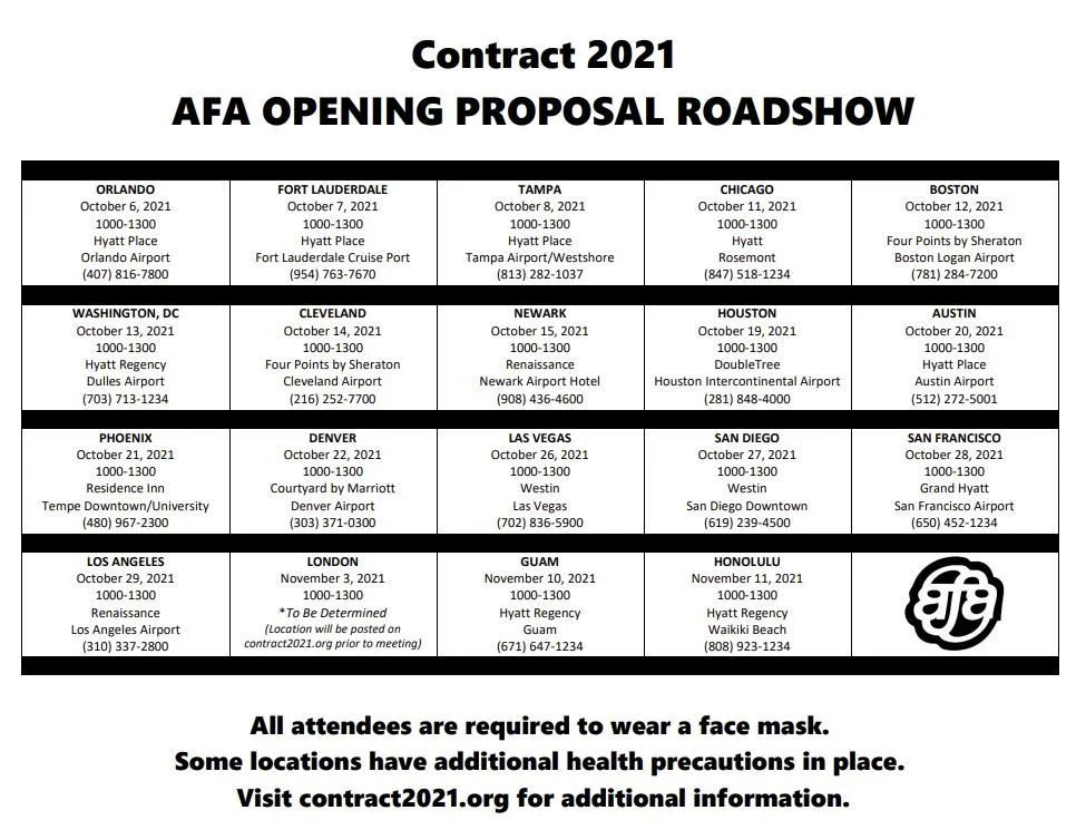 From October 6, 2021 to November 11, 2021 your Negotiating Committee visited all 19 locations where Flight Attendants are based to present our Opening Proposal for the 2021 Contract Negotiations.