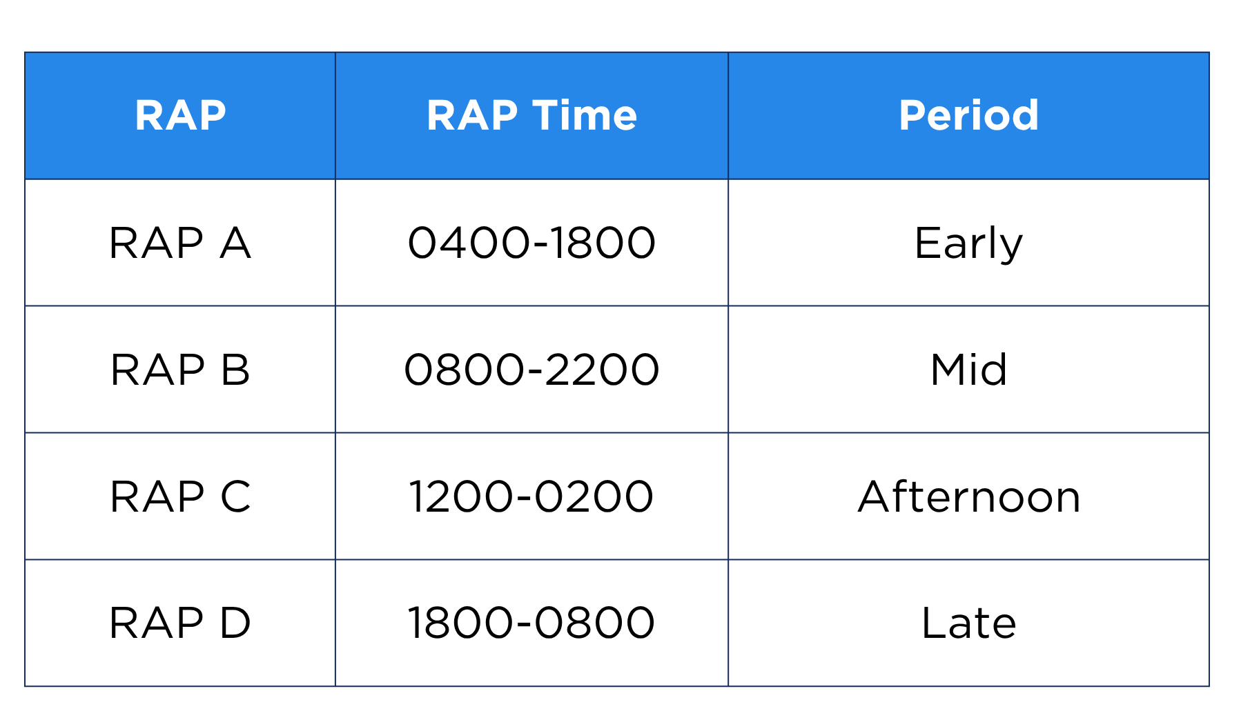 *Actual RAPs will be determined on a daily basis by scheduling and do not have to match the assignments shown here. These are examples only.
