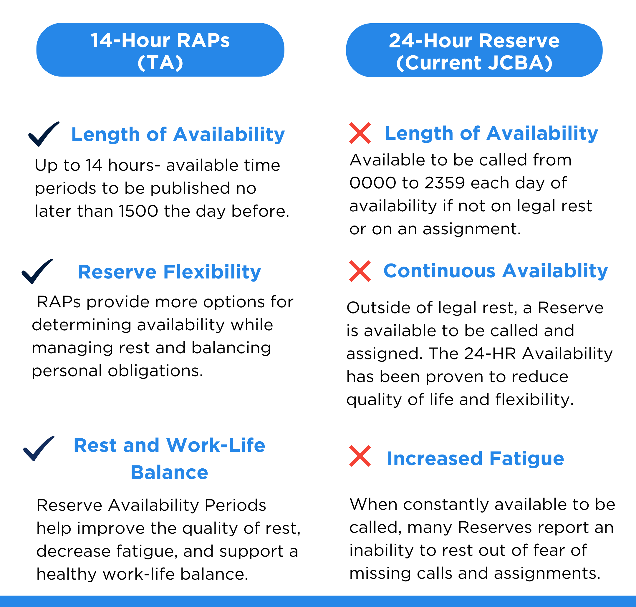The Reserve section in our Tentative Agreement (TA) introduces Reserve Availability Periods (RAPs) to improve scheduling and rest management for Reserves. RAPs provide flexibility with a window of up to 14 hours for assignments, allowing Reserves more control over their availability.